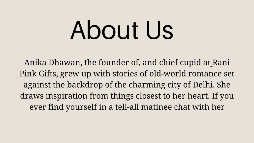 AboutUs Anika Dhawan, the founder of, and chief cupid at Rani Pink Gifts, grew up with stories of old-world romance set against the backdrop of the charming city of Delhi. She draws inspiration from things closest to her heart. If you ever find yourself in a tell-all matinee chat with her