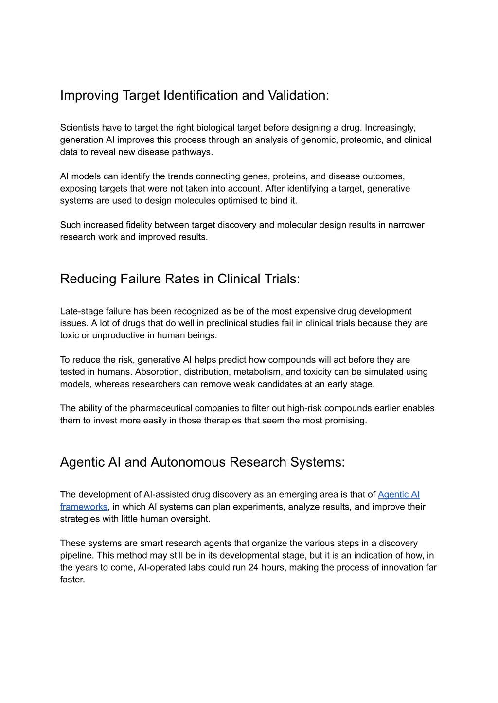Improving Target Identification and Validation: Scientists have to target the right biological target before designing a drug. Increasingly, generation AI improves this process through an analysis of genomic, proteomic, and clinical data to reveal new disease pathways. AI models can identify the trends connecting genes, proteins, and disease outcomes, exposing targets that were not taken into account. After identifying a target, generative systems are used to design molecules optimised to bind it. Such increased fidelity between target discovery and molecular design results in narrower research work and improved results. Reducing Failure Rates in Clinical Trials: Late-stage failure has been recognized as be of the most expensive drug development issues. A lot of drugs that do well in preclinical studies fail in clinical trials because they are toxic or unproductive in human beings. To reduce the risk, generative AI helps predict how compounds will act before they are tested in humans. Absorption, distribution, metabolism, and toxicity can be simulated using models, whereas researchers can remove weak candidates at an early stage. The ability of the pharmaceutical companies to filter out high-risk compounds earlier enables them to invest more easily in those therapies that seem the most promising. Agentic AI and Autonomous Research Systems: The development of AI-assisted drug discovery as an emerging area is that of Agentic AI frameworks, in which AI systems can plan experiments, analyze results, and improve their strategies with little human oversight. These systems are smart research agents that organize the various steps in a discovery pipeline. This method may still be in its developmental stage, but it is an indication of how, in the years to come, AI-operated labs could run 24 hours, making the process of innovation far faster.