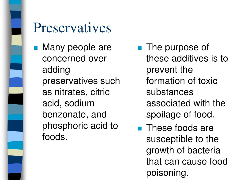 Many people are concerned over adding preservatives such as nitrates, citric acid, sodium benzonate, and phosphoric acid to foods. The purpose of these additives is to prevent the formation of toxic substances associated with the spoilage of food. These foods are susceptible to the growth of bacteria that can cause food poisoning. Preservatives
