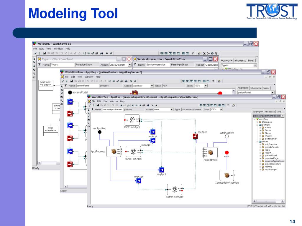 Research Approach • System Analysis • Risks and Threats Analysis • Policy Analysis • Domain analysis • VU Medical School • TRUST research groups (Vanderbilt, Stanford) • Domain Specific Modeling Languages • Domain Specific Policy Languages • Privacy preservation • Modeling • VU Medical School • TRUST research groups (Vanderbilt, Stanford, Cornell) • Fast prototyping • BPEL4WS tools • TRUST research groups (Vanderbilt, Stanford, Berkeley) • Mapping to target architecture -> recommendations