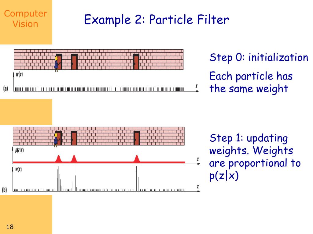 Step 0: initialization Each particle has the same weight Step 1: updating weights. Weights are proportional to p(z|x) Example 2: Particle Filter