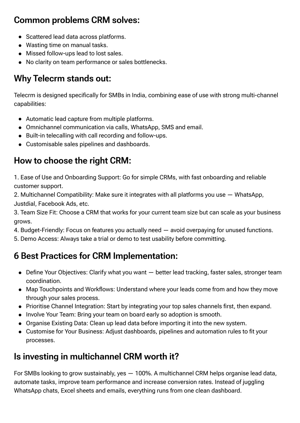 Common problems CRM solves: Scattered lead data across platforms. Wasting time on manual tasks. Missed follow-ups lead to lost sales. No clarity on team performance or sales bottlenecks. Why Telecrm stands out: Telecrm is designed specifically for SMBs in India, combining ease of use with strong multi-channel capabilities: Automatic lead capture from multiple platforms. Omnichannel communication via calls, WhatsApp, SMS and email. Built-in telecalling with call recording and follow-ups. Customisable sales pipelines and dashboards. How to choose the right CRM: 1. Ease of Use and Onboarding Support: Go for simple CRMs, with fast onboarding and reliable customer support. 2. Multichannel Compatibility: Make sure it integrates with all platforms you use — WhatsApp, Justdial, Facebook Ads, etc. 3. Team Size Fit: Choose a CRM that works for your current team size but can scale as your business grows. 4. Budget-Friendly: Focus on features you actually need — avoid overpaying for unused functions. 5. Demo Access: Always take a trial or demo to test usability before committing. 6 Best Practices for CRM Implementation: Define Your Objectives: Clarify what you want — better lead tracking, faster sales, stronger team coordination. Map Touchpoints and Workflows: Understand where your leads come from and how they move through your sales process. Prioritise Channel Integration: Start by integrating your top sales channels first, then expand. Involve Your Team: Bring your team on board early so adoption is smooth. Organise Existing Data: Clean up lead data before importing it into the new system. Customise for Your Business: Adjust dashboards, pipelines and automation rules to fit your processes. Is investing in multichannel CRM worth it? For SMBs looking to grow sustainably, yes — 100%. A multichannel CRM helps organise lead data, automate tasks, improve team performance and increase conversion rates. Instead of juggling WhatsApp chats, Excel sheets and emails, everything runs from one clean dashboard.
