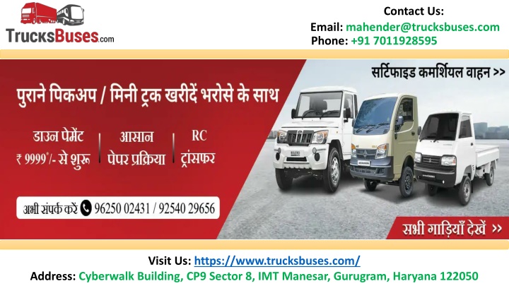 Contact Us: Email: mahender@trucksbuses.com Phone: +91 7011928595 Visit Us: https://www.trucksbuses.com/ Address: Cyberwalk Building, CP9 Sector 8, IMT Manesar, Gurugram, Haryana 122050