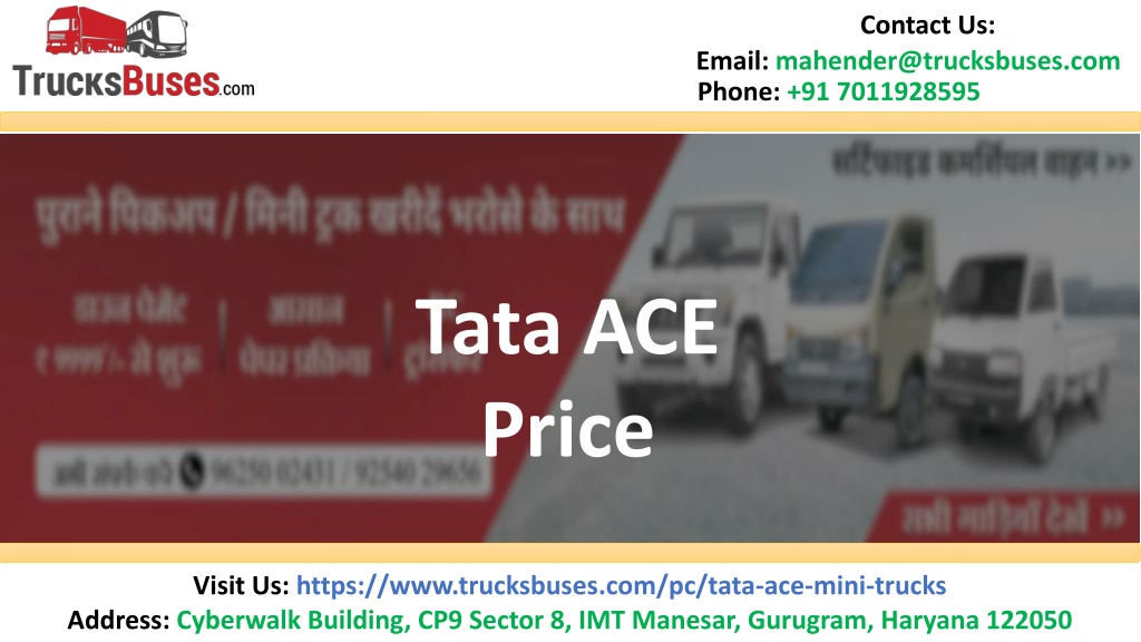 Contact Us: Email: mahender@trucksbuses.com Phone: +91 7011928595 Tata ACE Price Visit Us: https://www.trucksbuses.com/pc/tata-ace-mini-trucks Address: Cyberwalk Building, CP9 Sector 8, IMT Manesar, Gurugram, Haryana 122050