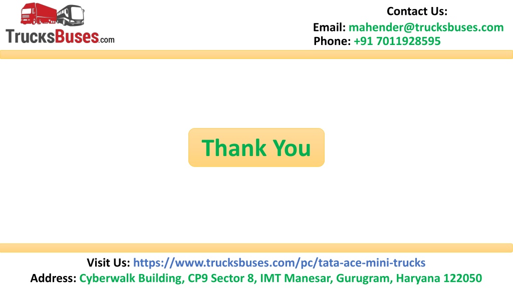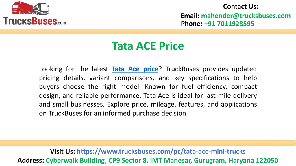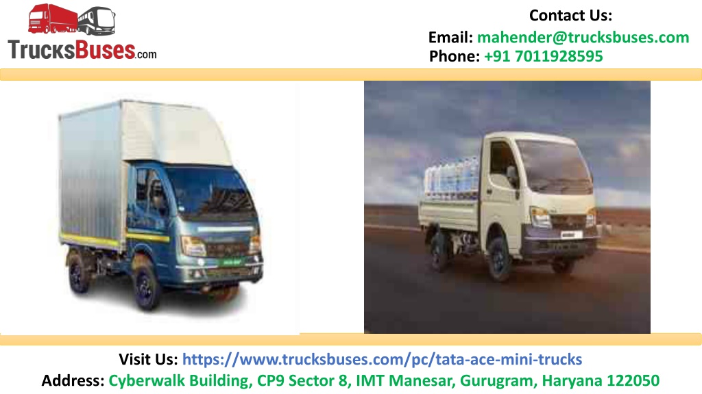 Contact Us: Email: mahender@trucksbuses.com Phone: +91 7011928595 Thank You Visit Us: https://www.trucksbuses.com/pc/tata-ace-mini-trucks Address: Cyberwalk Building, CP9 Sector 8, IMT Manesar, Gurugram, Haryana 122050