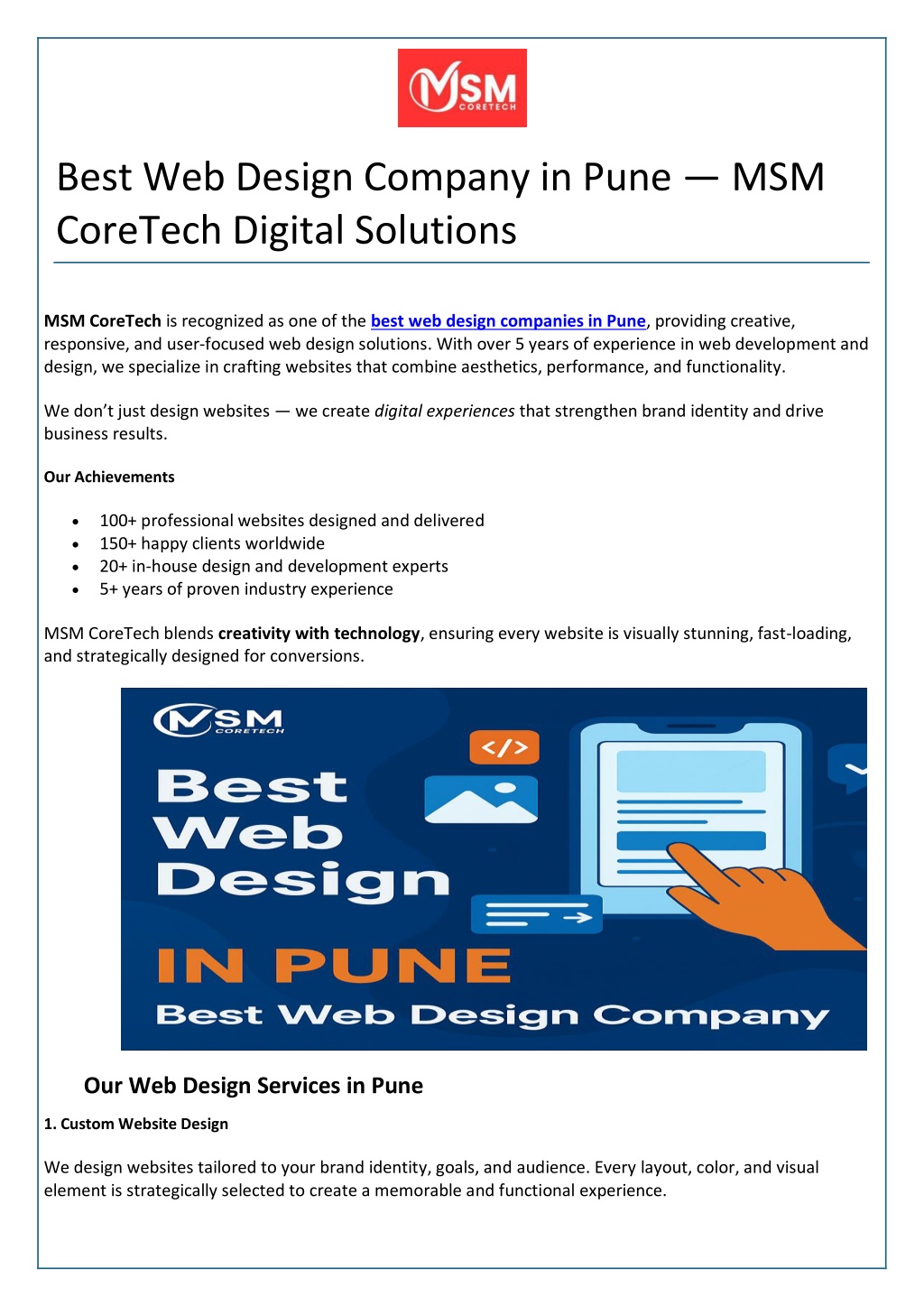 1. Best Web Design Company in Pune — MSM CoreTech Digital Solutions MSM CoreTech is recognized as one of the best web design companies in Pune, providing creative, responsive, and user-focused web design solutions. With over 5 years of experience in web development and design, we specialize in crafting websites that combine aesthetics, performance, and functionality. We don’t just design websites — we create digital experiences that strengthen brand identity and drive business results. Our Achievements 100+ professional websites designed and delivered 150+ happy clients worldwide 20+ in-house design and development experts 5+ years of proven industry experience MSM CoreTech blends creativity with technology, ensuring every website is visually stunning, fast-loading, and strategically designed for conversions. Our Web Design Services in Pune 1. Custom Website Design We design websites tailored to your brand identity, goals, and audience. Every layout, color, and visual element is strategically selected to create a memorable and functional experience.
