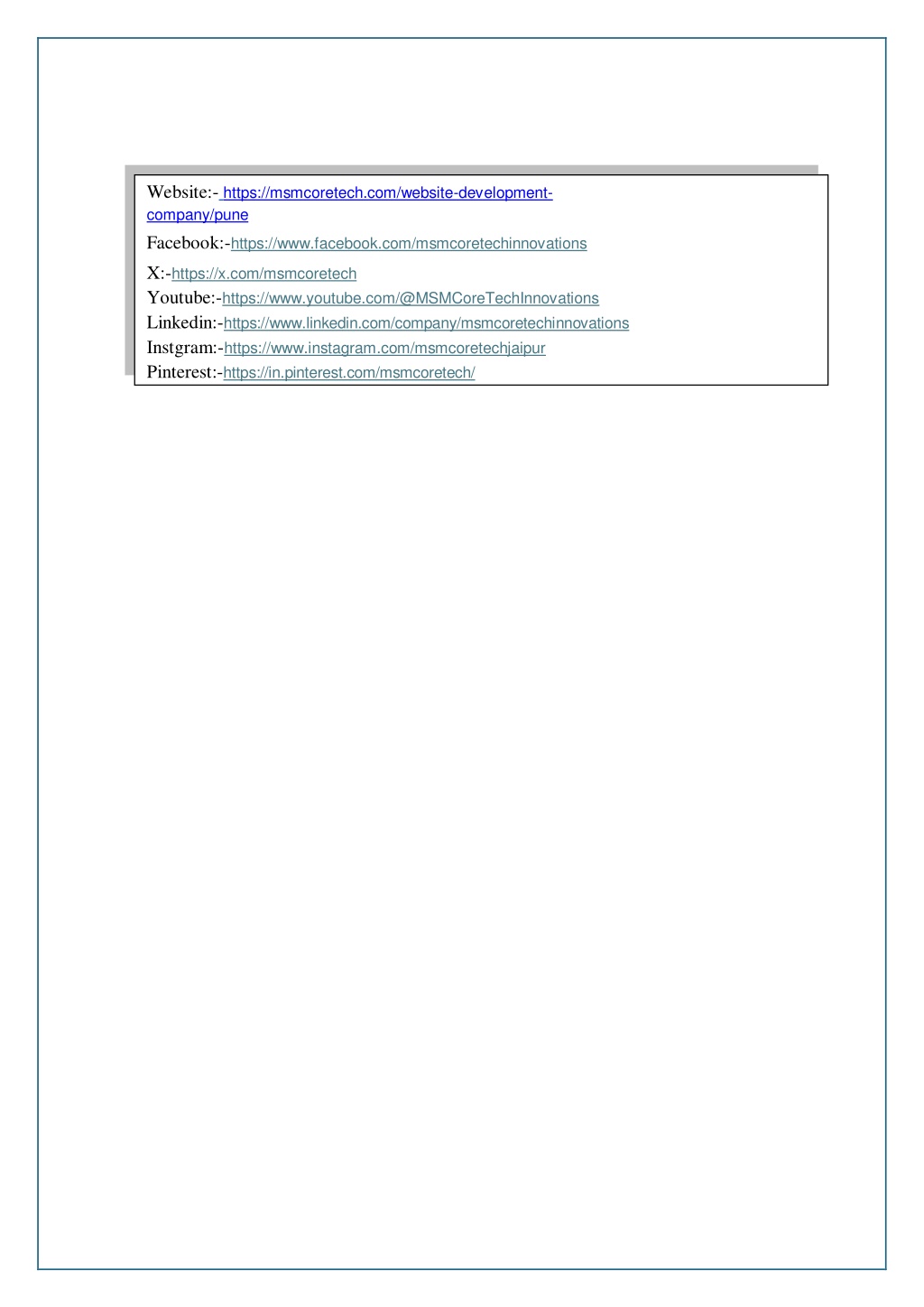 5. Website:- https://msmcoretech.com/website-development- company/pune Facebook:-https://www.facebook.com/msmcoretechinnovations X:-https://x.com/msmcoretech Youtube:-https://www.youtube.com/@MSMCoreTechInnovations Linkedin:-https://www.linkedin.com/company/msmcoretechinnovations Instgram:-https://www.instagram.com/msmcoretechjaipur Pinterest:-https://in.pinterest.com/msmcoretech/