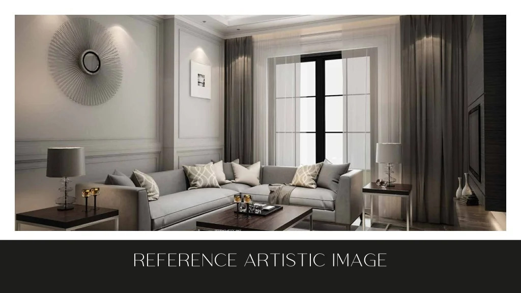 LIVING ROOM~ A SOARING SPACE PERFECT FOR ALL ENTERTAINING MOMENTS The living rooms are striking in their simplicity yet luxurious finishes and generous frontages, thanks to its towering doors and windows, focusing on the plentiful daylight and spectacular views of sunrise and sunsets. KITCHEN~ ENJOY A CUP OF COFFEE AS YOU RELAX AT THE TIMELESS, UNDERSTATED ISLAND COUNTER. All kitchens offer premium glass and wood cabinetry, high end modular storage, luxury REFERENCE ARTISTIC IMAGE plumbing fixtures, ultra practical island counter and branded appliance package including, RO, HOB, Chimney etc.
