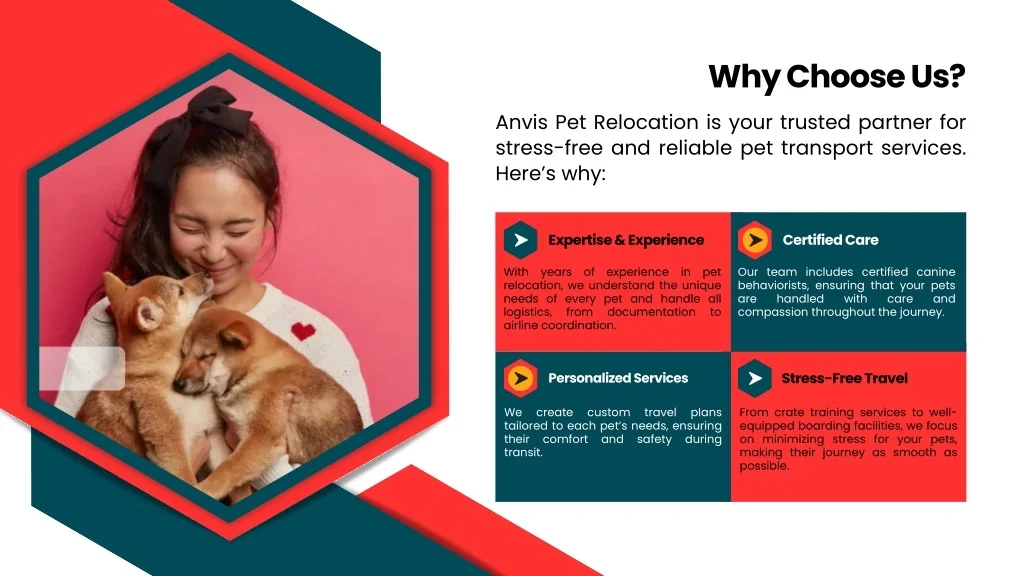 About Us Anvis Pet Relocation is a trusted provider of specialized pet transportation dedicated to ensuring the safe and stress-free travel of pets around the world. With a deep understanding of the challenges involved in pet relocation, our team handles every detail, from documentation and logistics to coordinating airline arrangements. services, Our expertise, combined with a commitment to the well-being of your pets, makes us the preferred choice for seamless international and domestic relocations. companion is traveling to a new home or returning to you, Anvis guarantees a smooth and caring journey. Whether your furry Pet Relocation