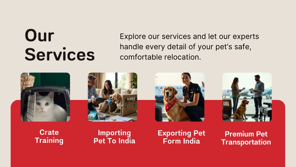 3. Our Services Explore our services and let our experts handle every detail of your pet’s safe, comfortable relocation. Crate Training Importing Pet To India Exporting Pet Form India Premium Pet Transportation