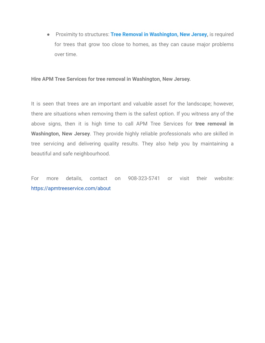 ●Proximity to structures: Tree Removal in Washington, New Jersey, is required for trees that grow too close to homes, as they can cause major problems over time. Hire APM Tree Services for tree removal in Washington, New Jersey. It is seen that trees are an important and valuable asset for the landscape; however, there are situations when removing them is the safest option. If you witness any of the above signs, then it is high time to call APM Tree Services for tree removal in Washington, New Jersey. They provide highly reliable professionals who are skilled in tree servicing and delivering quality results. They also help you by maintaining a beautiful and safe neighbourhood. For more details, contact on 908-323-5741 or visit their website: https://apmtreeservice.com/about