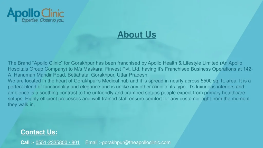 Contact Us: Call :- 0551-2335800 / 801Email :-gorakhpur@theapolloclinic.com