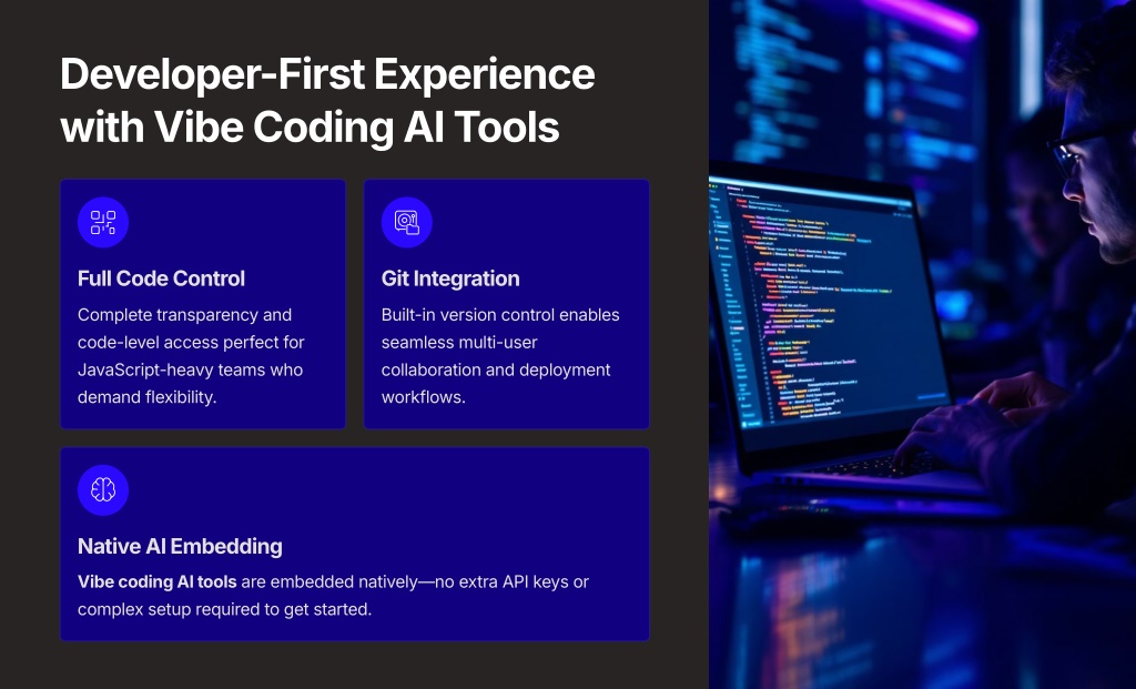 3. Developer-First Experience with Vibe Coding AI Tools Full Code Control Git Integration Complete transparency and code-level access perfect for JavaScript-heavy teams who demand flexibility. Built-in version control enables seamless multi-user collaboration and deployment workflows. Native AI Embedding Vibe coding AI tools are embedded natively4no extra API keys or complex setup required to get started.