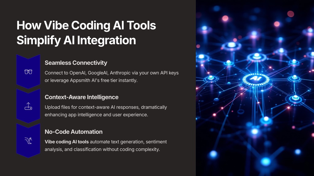 6. How Vibe Coding AI Tools Simplify AI Integration Seamless Connectivity Connect to OpenAI, GoogleAI, Anthropic via your own API keys or leverage Appsmith AI's free tier instantly. Context-Aware Intelligence Upload files for context-aware AI responses, dramatically enhancing app intelligence and user experience. No-Code Automation Vibe coding AI tools automate text generation, sentiment analysis, and classification without coding complexity.