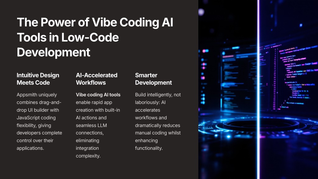 2. The Power of Vibe Coding AI Tools in Low-Code Development Intuitive Design Meets Code AI-Accelerated Workflows Smarter Development Appsmith uniquely combines drag-and- drop UI builder with JavaScript coding flexibility, giving developers complete control over their applications. Vibe coding AI tools enable rapid app creation with built-in AI actions and seamless LLM connections, eliminating integration complexity. Build intelligently, not laboriously: AI accelerates workflows and dramatically reduces manual coding whilst enhancing functionality.