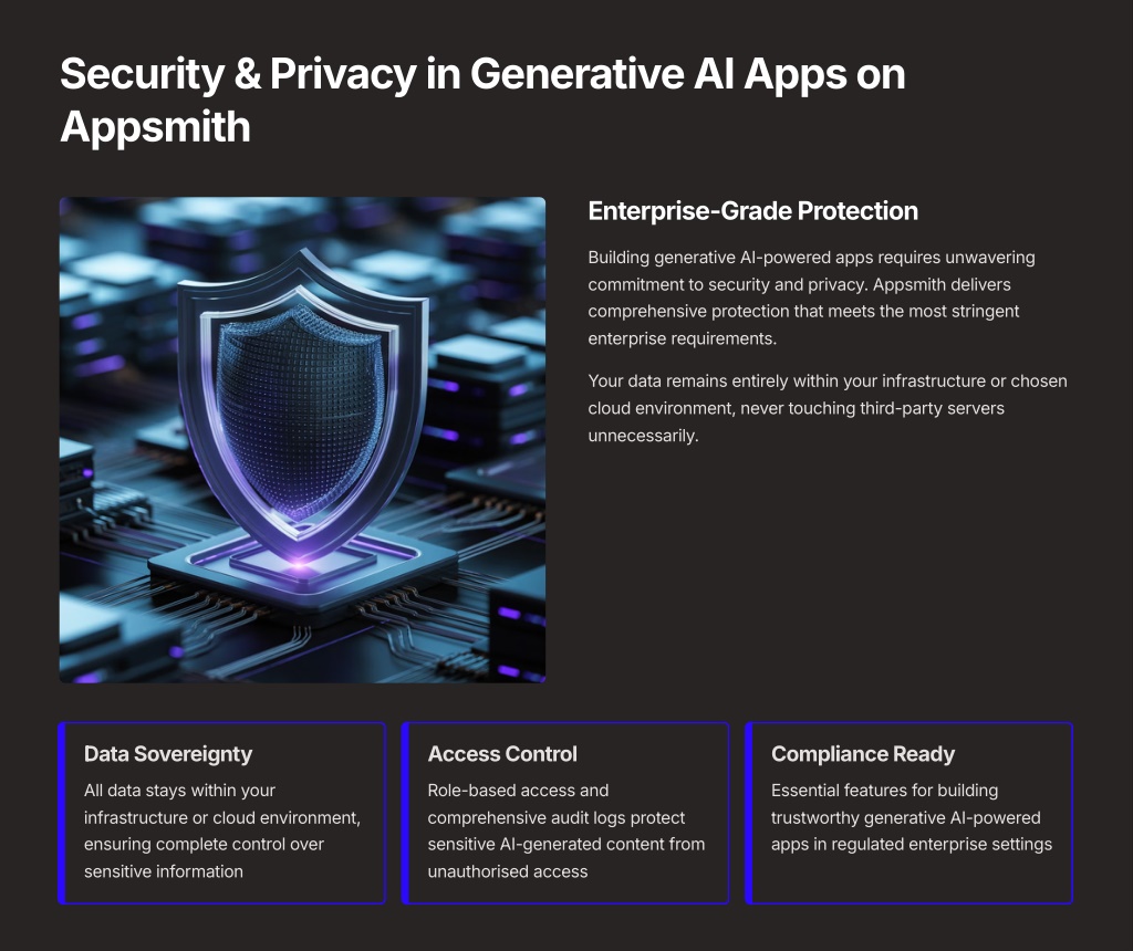 Security & Privacy in Generative AI Apps on Appsmith Enterprise-Grade Protection Building generative AI-powered apps requires unwavering commitment to security and privacy. Appsmith delivers comprehensive protection that meets the most stringent enterprise requirements. Your data remains entirely within your infrastructure or chosen cloud environment, never touching third-party servers unnecessarily. Data Sovereignty Access Control Compliance Ready All data stays within your infrastructure or cloud environment, ensuring complete control over sensitive information Role-based access and comprehensive audit logs protect sensitive AI-generated content from unauthorised access Essential features for building trustworthy generative AI-powered apps in regulated enterprise settings