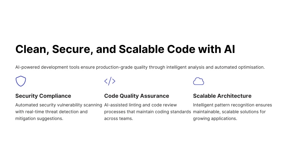 Clean, Secure, and Scalable Code with AI AI-powereddevelopmenttoolsensureproduction-gradequalitythroughintelligentanalysisandautomatedoptimisation. SecurityCompliance CodeQualityAssurance ScalableArchitecture Automated security vulnerability scanning with real-time threat detection and mitigation suggestions. AI-assisted linting and code review processes that maintain coding standards across teams. Intelligent pattern recognition ensures maintainable, scalable solutions for growing applications.