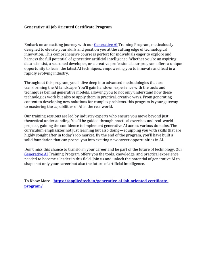 Generative AI Job Oriented Certificate Program Embark on an exciting journey with our Generative AI Training Program, meticulously designed to elevate your skills and position you at the cutting edge of technological innovation. This comprehensive course is perfect for individuals eager to explore and harness the full potential of generative artificial intelligence. Whether you’re an aspiring data scientist, a seasoned developer, or a creative professional, our program offers a unique opportunity to learn the latest AI techniques, empowering you to innovate and lead in a rapidly evolving industry. Throughout this program, you’ll dive deep into advanced methodologies that are transforming the AI landscape. You’ll gain hands-on experience with the tools and techniques behind generative models, allowing you to not only understand how these technologies work but also to apply them in practical, creative ways. From generating content to developing new solutions for complex problems, this program is your gateway to mastering the capabilities of AI in the real world. Our training sessions are led by industry experts who ensure you move beyond just theoretical understanding. You’ll be guided through practical exercises and real-world projects, gaining the confidence to implement generative AI across various domains. The curriculum emphasizes not just learning but also doing—equipping you with skills that are highly sought after in today’s job market. By the end of the program, you’ll have built a solid foundation that can propel you into exciting new career opportunities in AI. Don’t miss this chance to transform your career and be part of the future of technology. Our Generative AI Training Program offers you the tools, knowledge, and practical experience needed to become a leader in this field. Join us and unlock the potential of generative AI to shape not only your career but also the future of artificial intelligence. To Know More https://appliedtech.in/generative-ai-job-oriented-certificate- program/