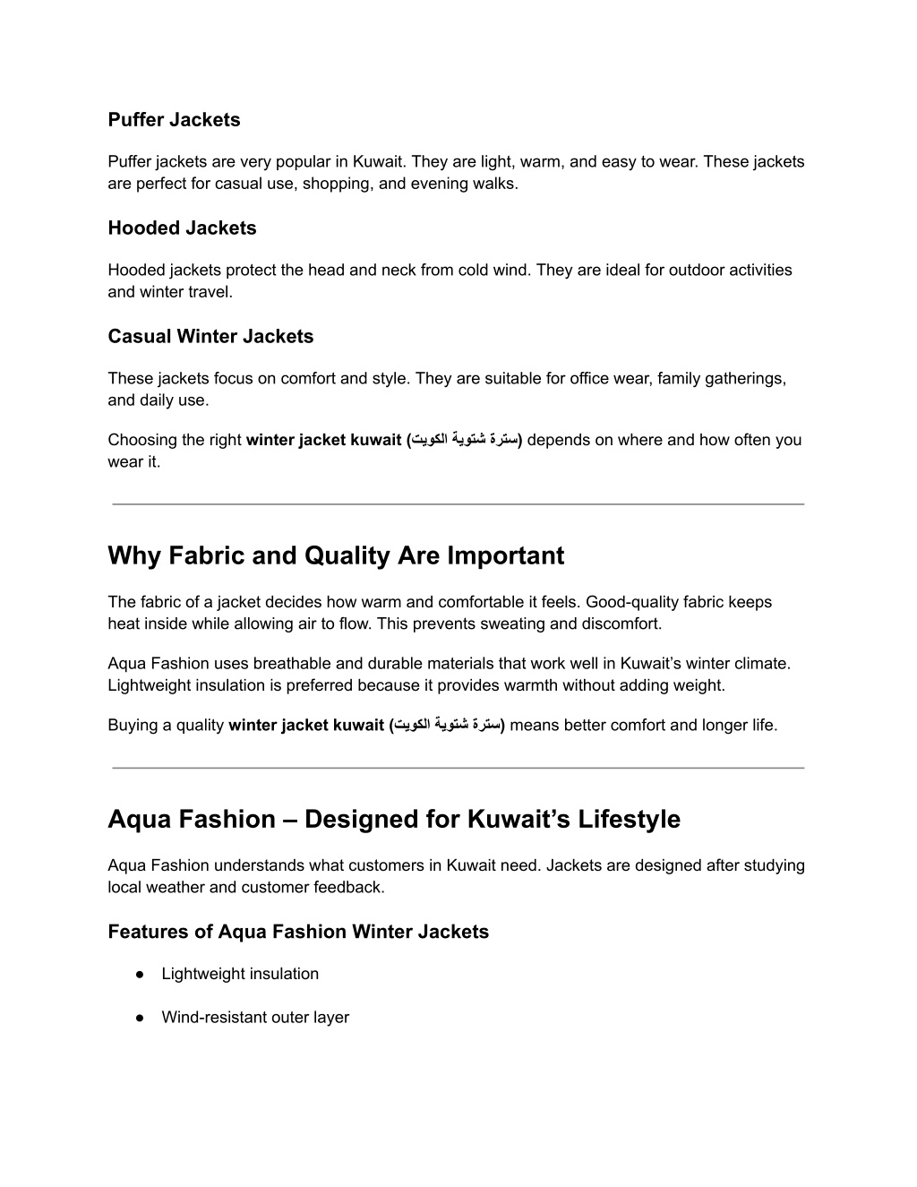 Winter Jacket Kuwait: Your Easy Guide to Warmth and Style Winter in Kuwait is usually short, but the weather can still feel cold, especially during the evening. Desert winds and low night temperatures make warm clothing important. Many people also travel during winter, which increases the need for a good jacket. A winter jacket should keep you warm, feel comfortable, and match your style. At Aqua Fashion, winter jackets are designed for real life in Kuwait. They are made to suit local weather, daily routines, and modern fashion needs. This guide will help you understand how to choose the best winter jacket kuwait ( ﺔﯾوﺗﺷ تﯾوﻛﻟا ةرﺗﺳ ) and why quality matters. What Is Winter Like in Kuwait? Kuwait does not have very cold winters like Europe or North America. Daytime temperatures are often pleasant. However, evenings and nights can be cold because of wind. Temperatures usually stay between 8°C and 18°C. Because of this, heavy snow jackets are not needed. Instead, people prefer lightweight jackets that protect from wind and keep the body warm. A well-chosen winter jacket kuwait ( تﯾوﻛﻟا) is enough for daily use and travel. ﺔﯾوﺗﺷ ةرﺗﺳ Key Winter Points ● Cool nights and evenings ● Windy desert weather ● Mild days ● Travel season to colder countries Popular Winter Jacket Styles in Kuwait Different people need different jacket styles. Aqua Fashion offers a wide range of options to suit every lifestyle.