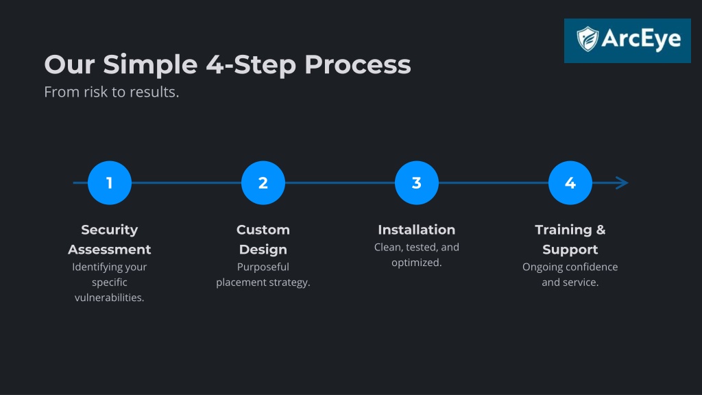 5. Our Simple 4-Step Process From risk to results. 1 2 3 4 Security Assessment Identifying your specific vulnerabilities. Custom Design Purposeful placement strategy. Installation Clean, tested, and optimized. Training & Support Ongoing confidence and service.