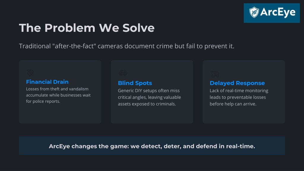 2. The Problem We Solve Traditional "after-the-fact" cameras document crime but fail to prevent it. 💸 Financial Drain Losses from theft and vandalism accumulate while businesses wait for police reports. 🕶️ Blind Spots Generic DIY setups often miss critical angles, leaving valuable assets exposed to criminals. 🐢 Delayed Response Lack of real-time monitoring leads to preventable losses before help can arrive. ArcEye changes the game: we detect, deter, and defend in real-time.