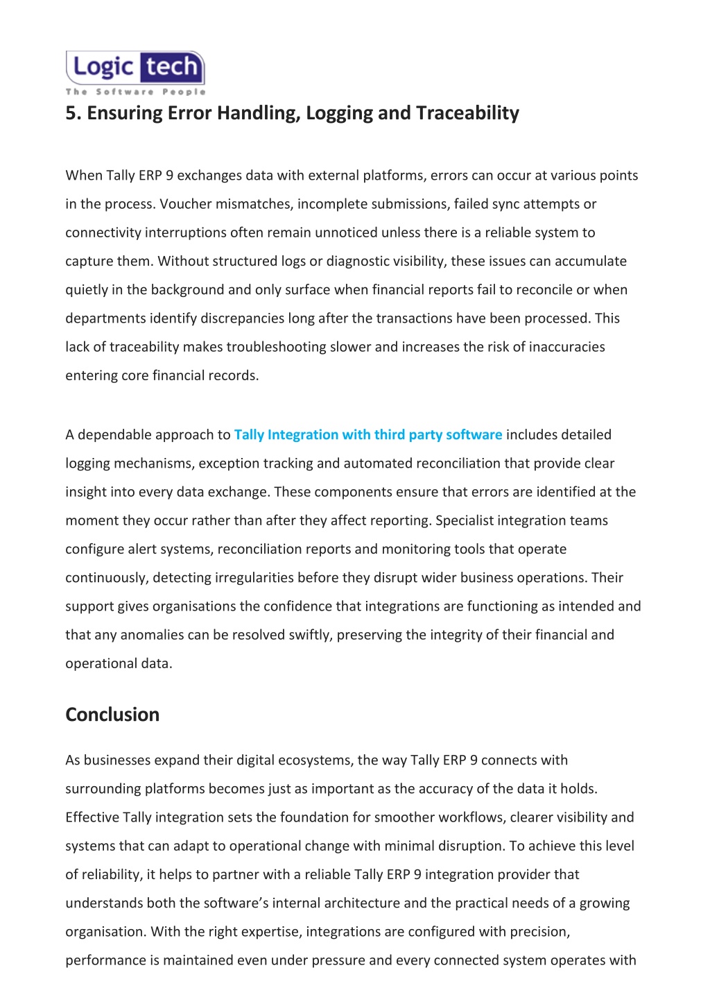 5. Ensuring Error Handling, Logging and Traceability When Tally ERP 9 exchanges data with external platforms, errors can occur at various points in the process. Voucher mismatches, incomplete submissions, failed sync attempts or connectivity interruptions often remain unnoticed unless there is a reliable system to capture them. Without structured logs or diagnostic visibility, these issues can accumulate quietly in the background and only surface when financial reports fail to reconcile or when departments identify discrepancies long after the transactions have been processed. This lack of traceability makes troubleshooting slower and increases the risk of inaccuracies entering core financial records. A dependable approach to Tally Integration with third party software includes detailed logging mechanisms, exception tracking and automated reconciliation that provide clear insight into every data exchange. These components ensure that errors are identified at the moment they occur rather than after they affect reporting. Specialist integration teams configure alert systems, reconciliation reports and monitoring tools that operate continuously, detecting irregularities before they disrupt wider business operations. Their support gives organisations the confidence that integrations are functioning as intended and that any anomalies can be resolved swiftly, preserving the integrity of their financial and operational data. Conclusion As businesses expand their digital ecosystems, the way Tally ERP 9 connects with surrounding platforms becomes just as important as the accuracy of the data it holds. Effective Tally integration sets the foundation for smoother workflows, clearer visibility and systems that can adapt to operational change with minimal disruption. To achieve this level of reliability, it helps to partner with a reliable Tally ERP 9 integration provider that understands both the software’s internal architecture and the practical needs of a growing organisation. With the right expertise, integrations are configured with precision, performance is maintained even under pressure and every connected system operates with