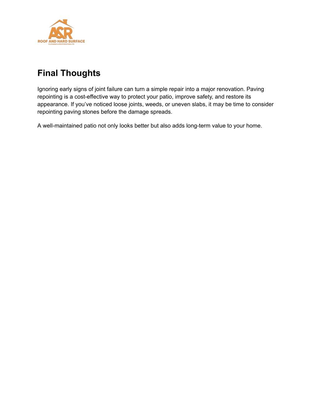 Final Thoughts Ignoring early signs of joint failure can turn a simple repair into a major renovation. Paving repointing is a cost-effective way to protect your patio, improve safety, and restore its appearance. If you’ve noticed loose joints, weeds, or uneven slabs, it may be time to consider repointing paving stones before the damage spreads. A well-maintained patio not only looks better but also adds long-term value to your home.