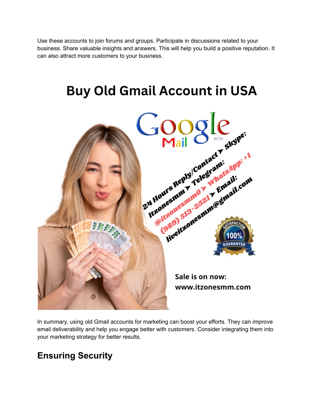 Buying old Gmail accounts can be beneficial for various needs. But it also comes with risks. Ensuring security is crucial to protect your data and privacy. Without proper precautions, you might fall prey to scams or data breaches. 24 Hours Reply/Contact ➤ Skype: Itzonesmm ➤ Telegram: @itzonesmm0 ➤ WhatsApp: +1 (989) 513-2521 ➤ Email: liveitzonesmm@gmail.com Protecting Account Privacy Protecting your account privacy is essential. Start by changing the password immediately. Use a strong, unique password. Enable two-factor authentication. This adds an extra layer of security. Regularly monitor account activity. Look for any unusual activities. Update your recovery options. Add a phone number and secondary email. These steps help secure your account. Avoiding Scams Avoiding scams is vital when buying old Gmail accounts. Choose a trusted provider like Itzonesmm. Check for reviews and ratings. Avoid deals that seem too good to be true. Verify the account's authenticity before purchase. Ask for a demo if possible. Make payments through secure channels. This reduces the risk of fraud. Stay informed about common scams. Knowledge is your best defense. Cost Considerations Purchasing old Gmail accounts can be a smart business move. Yet, understanding the cost is crucial. This section delves into the cost considerations of buying old Gmail accounts from Itzonesmm. Budgeting For Accounts Before buying, allocate a budget. Determine how much you can spend on Gmail accounts. Prices may vary based on the age and number of accounts. Consider creating a detailed budget plan. This helps in avoiding overspending. Here is a simple budgeting table: Compare prices from different sellers. This ensures you get the best deal. Look for sellers with positive reviews. Itzonesmm offers competitive prices, but it's wise to check other sources as well. ● Check account age. ● Verify the number of accounts. ● Look for bulk purchase discounts.