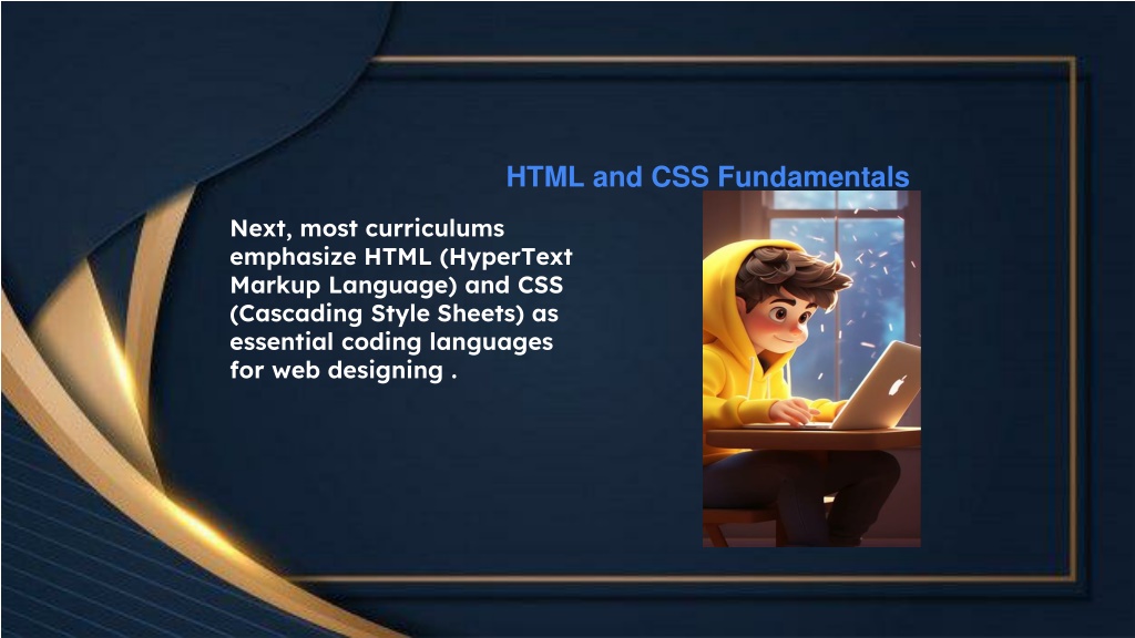 Next, most curriculums emphasize HTML (HyperText Markup Language) and CSS (Cascading Style Sheets) as essential coding languages for web designing . HTML and CSS Fundamentals