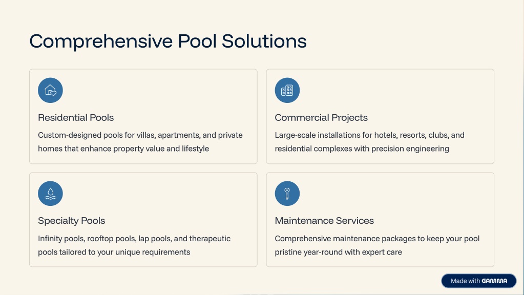 Comprehensive Pool Solutions Residential Pools Commercial Projects Custom-designed pools for villas, apartments, and private homes that enhance property value and lifestyle Large-scale installations for hotels, resorts, clubs, and residential complexes with precision engineering Specialty Pools Maintenance Services Infinity pools, rooftop pools, lap pools, and therapeutic pools tailored to your unique requirements Comprehensive maintenance packages to keep your pool pristine year-round with expert care