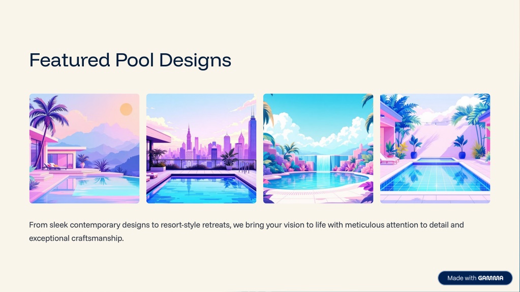 Featured Pool Designs From sleek contemporary designs to resort-style retreats, we bring your vision to life with meticulous attention to detail and exceptional craftsmanship.