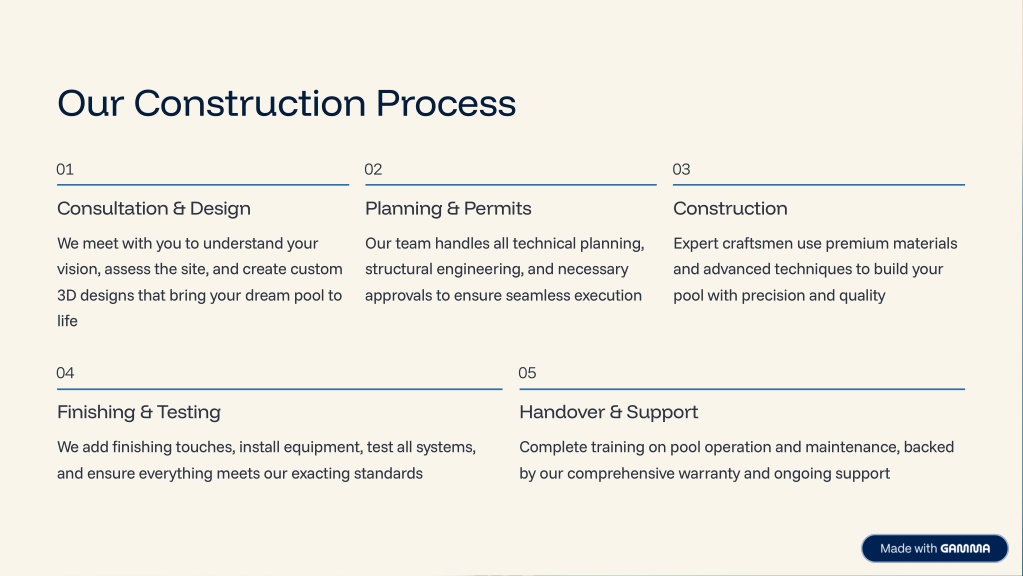 Our Construction Process 01 02 03 Consultation & Design Planning & Permits Construction We meet with you to understand your vision, assess the site, and create custom 3D designs that bring your dream pool to life Our team handles all technical planning, structural engineering, and necessary approvals to ensure seamless execution Expert craftsmen use premium materials and advanced techniques to build your pool with precision and quality 04 05 Finishing & Testing Handover & Support We add finishing touches, install equipment, test all systems, and ensure everything meets our exacting standards Complete training on pool operation and maintenance, backed by our comprehensive warranty and ongoing support