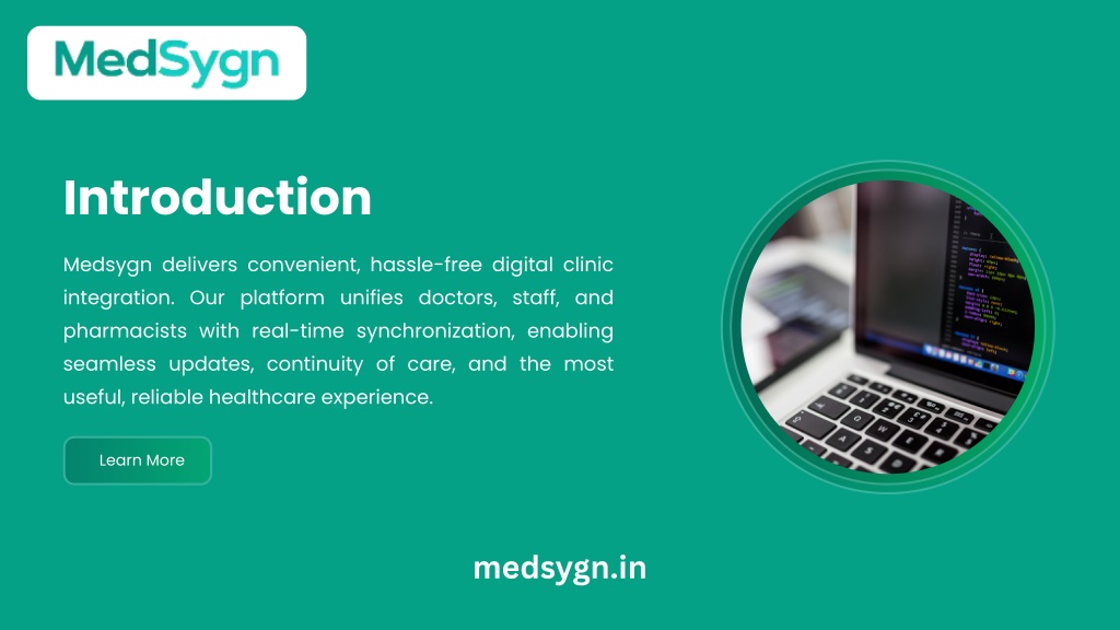 2. Introduction Medsygn delivers convenient, hassle-free digital clinic integration. Our platform unifies doctors, staff, and pharmacists with real-time synchronization, enabling seamless updates, continuity of care, and the most useful, reliable healthcare experience. Learn More medsygn.in
