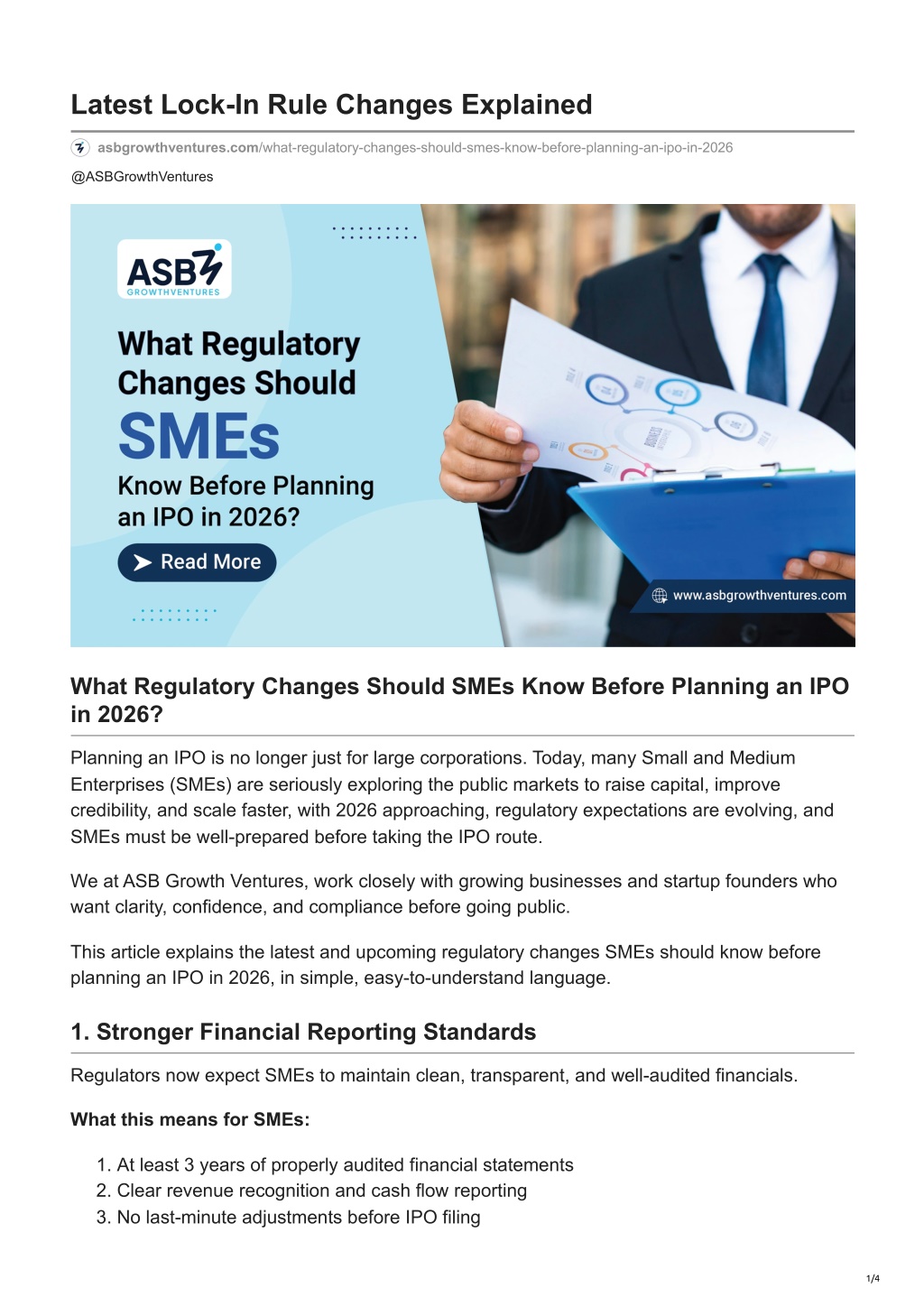 Latest Lock-In Rule Changes Explained asbgrowthventures.com/what-regulatory-changes-should-smes-know-before-planning-an-ipo-in-2026 @ASBGrowthVentures What Regulatory Changes Should SMEs Know Before Planning an IPO in 2026? Planning an IPO is no longer just for large corporations. Today, many Small and Medium Enterprises (SMEs) are seriously exploring the public markets to raise capital, improve credibility, and scale faster, with 2026 approaching, regulatory expectations are evolving, and SMEs must be well-prepared before taking the IPO route. We at ASB Growth Ventures, work closely with growing businesses and startup founders who want clarity, confidence, and compliance before going public. This article explains the latest and upcoming regulatory changes SMEs should know before planning an IPO in 2026, in simple, easy-to-understand language. 1. Stronger Financial Reporting Standards Regulators now expect SMEs to maintain clean, transparent, and well-audited financials. What this means for SMEs: 1. At least 3 years of properly audited financial statements 2. Clear revenue recognition and cash flow reporting 3. No last-minute adjustments before IPO filing 1/4