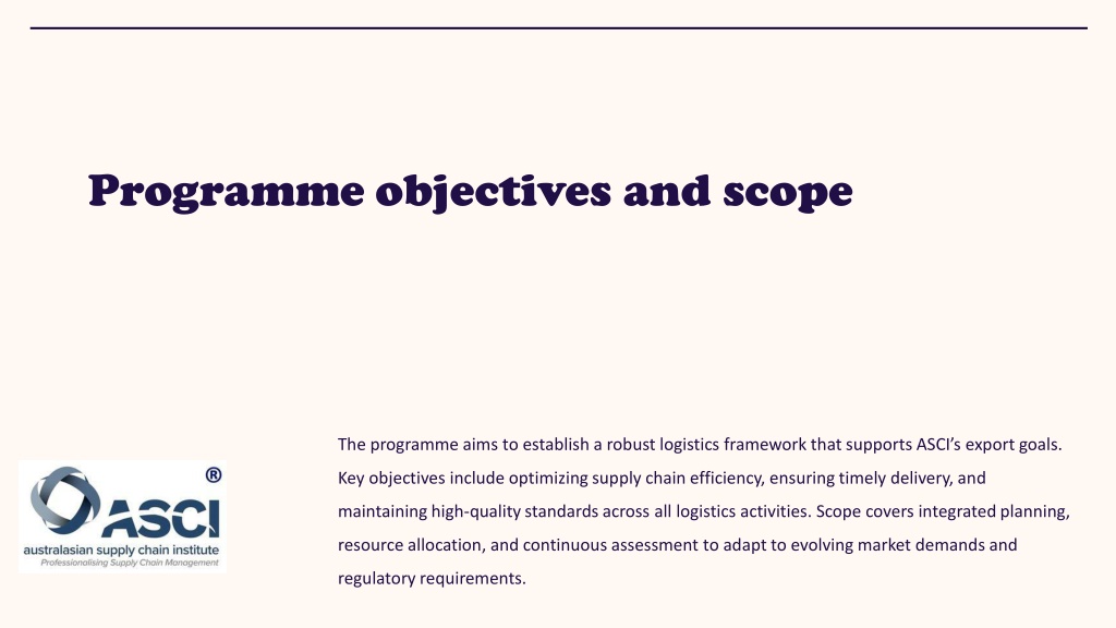 The programme aims to establish a robust logistics framework that supports ASCI’s export goals. Key objectives include optimizing supply chain efficiency, ensuring timely delivery, and maintaining high-quality standards across all logistics activities. Scope covers integrated planning, resource allocation, and continuous assessment to adapt to evolving market demands and regulatory requirements. Programme objectives and scope