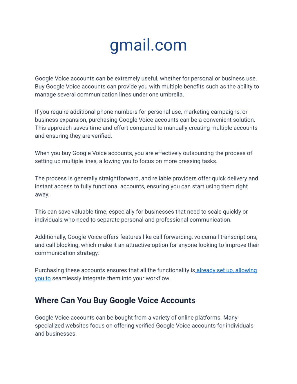 purchase a large number of accounts in bulk, making it ideal for those in need of scalable solutions. Their service also ensures that all accounts are verified, so you can be confident that you are receiving quality products. Platforms like Fiverr and Upwork also offer Google Voice accounts through individual sellers. These platforms have a range of different sellers, so you can find accounts tailored to your specific needs. However, it’s important to read reviews and check the credentials of sellers before making a purchase. While they can be more affordable, there’s a higher level of risk when purchasing through independent vendors. If you’re looking for more specialized services, agencies that focus on marketing and digital outreach may also sell Google Voice accounts, often bundled with other services to aid in outreach campaigns, customer support, or lead generation. How to Set Up Your Google Voice Account After Purchase Once you’ve purchased your Google Voice account, setting it up properly is the next crucial step to ensure that it functions effectively. The process is relatively simple, but it is important to follow each step carefully to avoid any issues. First, log in to your Google Voice account using the credentials provided by your seller. If the account is fully verified, you should have access to the dashboard immediately. If not, you may need to complete the verification process, which typically involves linking the account to a valid phone number. Next, set up your Google Voice number by linking it to your personal or business phone line. You can use Google Voice to forward calls to multiple numbers or devices, ensuring you never miss a call. This feature is particularly useful for businesses that need to handle calls across different departments or employees. Another key step is customizing your voicemail settings. You can set up voicemail greetings for different types of calls—personal or professional—and opt for voicemail