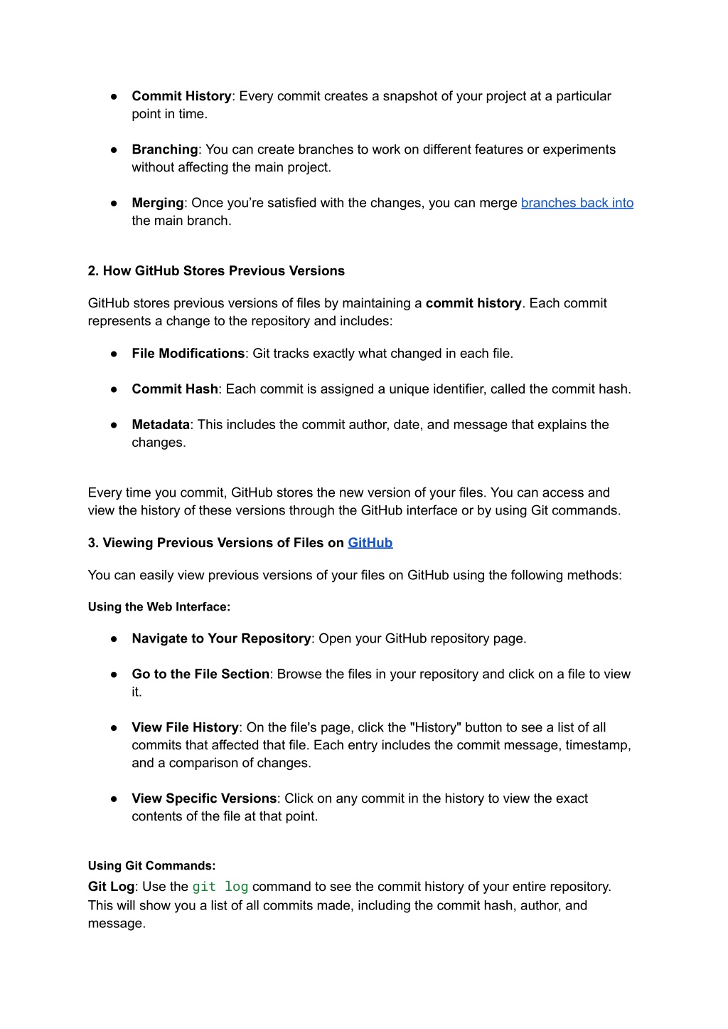 ● Commit History: Every commit creates a snapshot of your project at a particular point in time. ● Branching: You can create branches to work on different features or experiments without affecting the main project. ● Merging: Once you’re satisfied with the changes, you can merge branches back into the main branch. 2. How GitHub Stores Previous Versions GitHub stores previous versions of files by maintaining a commit history. Each commit represents a change to the repository and includes: ● File Modifications: Git tracks exactly what changed in each file. ● Commit Hash: Each commit is assigned a unique identifier, called the commit hash. ● Metadata: This includes the commit author, date, and message that explains the changes. Every time you commit, GitHub stores the new version of your files. You can access and view the history of these versions through the GitHub interface or by using Git commands. 3. Viewing Previous Versions of Files on GitHub You can easily view previous versions of your files on GitHub using the following methods: Using the Web Interface: ● Navigate to Your Repository: Open your GitHub repository page. ● Go to the File Section: Browse the files in your repository and click on a file to view it. ● View File History: On the file's page, click the "History" button to see a list of all commits that affected that file. Each entry includes the commit message, timestamp, and a comparison of changes. ● View Specific Versions: Click on any commit in the history to view the exact contents of the file at that point. Using Git Commands: Git Log: Use the git log command to see the commit history of your entire repository. This will show you a list of all commits made, including the commit hash, author, and message.