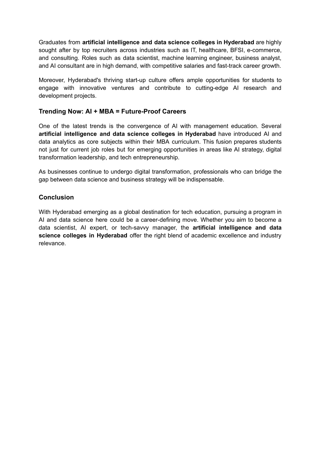 Graduates from artificial intelligence and data science colleges in Hyderabad are highly sought after by top recruiters across industries such as IT, healthcare, BFSI, e-commerce, and consulting. Roles such as data scientist, machine learning engineer, business analyst, and AI consultant are in high demand, with competitive salaries and fast-track career growth. Moreover, Hyderabad's thriving start-up culture offers ample opportunities for students to engage with innovative ventures and contribute to cutting-edge AI research and development projects. Trending Now: AI + MBA = Future-Proof Careers One of the latest trends is the convergence of AI with management education. Several artificial intelligence and data science colleges in Hyderabad have introduced AI and data analytics as core subjects within their MBA curriculum. This fusion prepares students not just for current job roles but for emerging opportunities in areas like AI strategy, digital transformation leadership, and tech entrepreneurship. As businesses continue to undergo digital transformation, professionals who can bridge the gap between data science and business strategy will be indispensable. Conclusion With Hyderabad emerging as a global destination for tech education, pursuing a program in AI and data science here could be a career-defining move. Whether you aim to become a data scientist, AI expert, or tech-savvy manager, the artificial intelligence and data science colleges in Hyderabad offer the right blend of academic excellence and industry relevance.