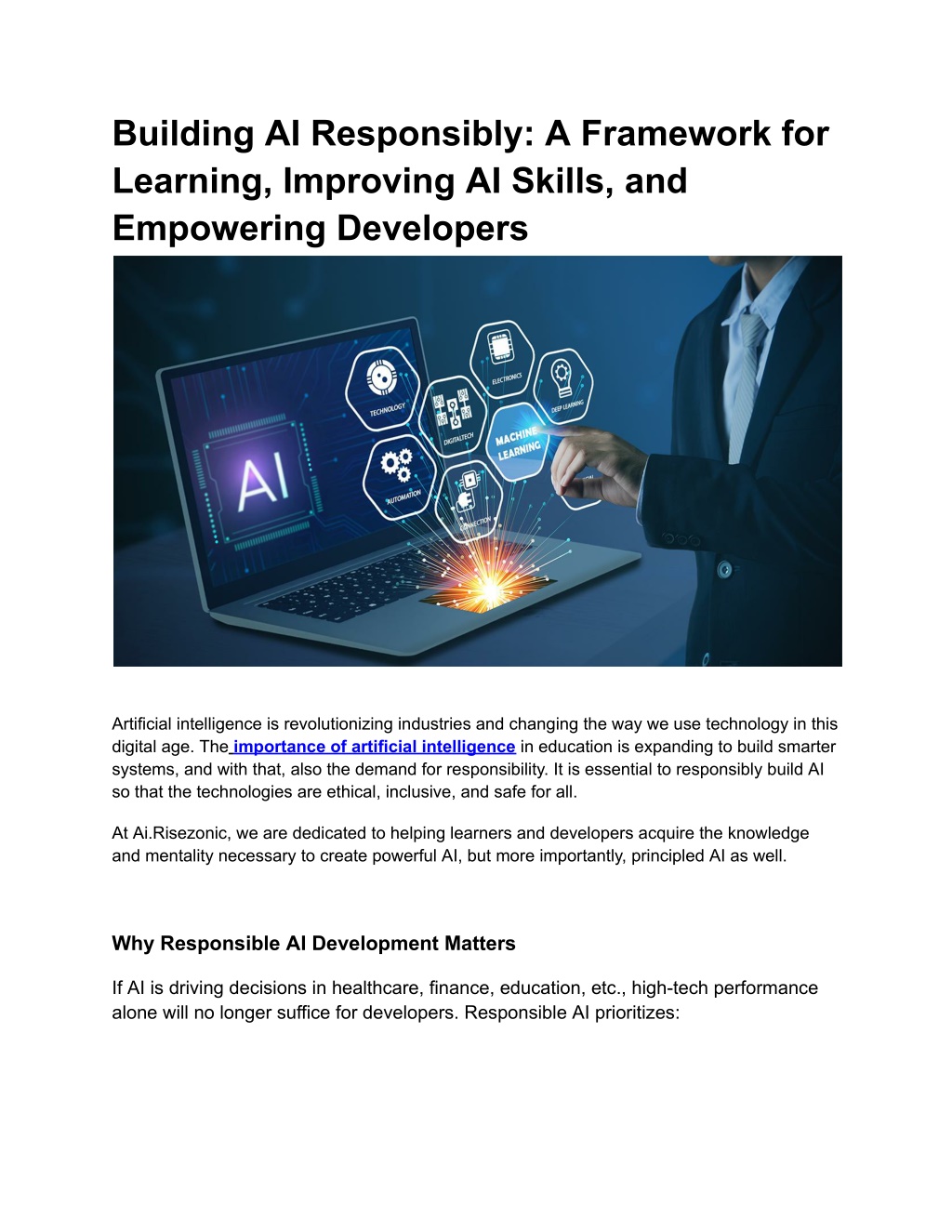 Building AI Responsibly: A Framework for Learning, Improving AI Skills, and Empowering Developers Artificial intelligence is revolutionizing industries and changing the way we use technology in this digital age. Theimportance of artificial intelligence in education is expanding to build smarter systems, and with that, also the demand for responsibility. It is essential to responsibly build AI so that the technologies are ethical, inclusive, and safe for all. At Ai.Risezonic, we are dedicated to helping learners and developers acquire the knowledge and mentality necessary to create powerful AI, but more importantly, principled AI as well. Why Responsible AI Development Matters If AI is driving decisions in healthcare, finance, education, etc., high-tech performance alone will no longer suffice for developers. Responsible AI prioritizes: