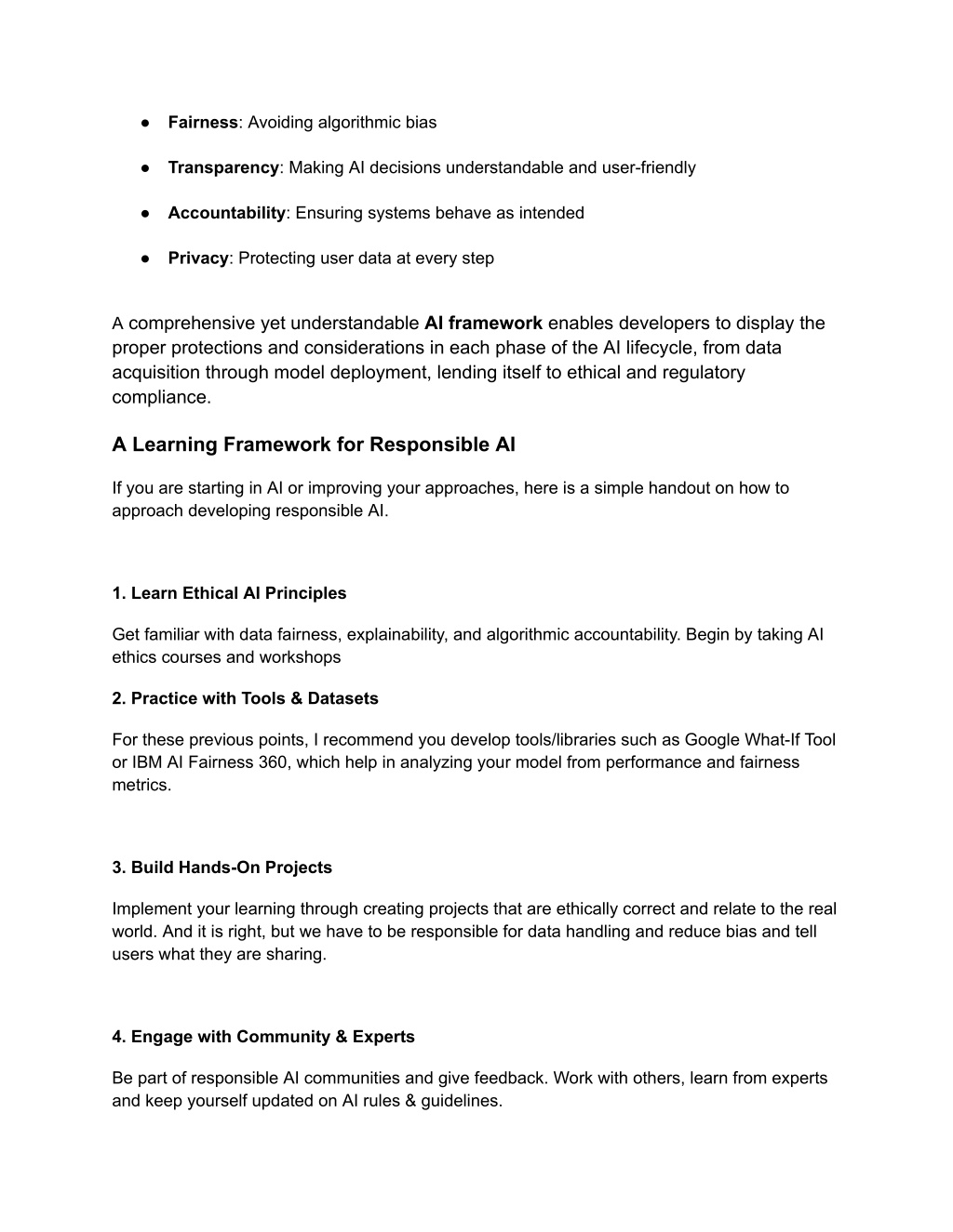 ● Fairness: Avoiding algorithmic bias ● Transparency: Making AI decisions understandable and user-friendly ● Accountability: Ensuring systems behave as intended ● Privacy: Protecting user data at every step A comprehensive yet understandable AI framework enables developers to display the proper protections and considerations in each phase of the AI lifecycle, from data acquisition through model deployment, lending itself to ethical and regulatory compliance. A Learning Framework for Responsible AI If you are starting in AI or improving your approaches, here is a simple handout on how to approach developing responsible AI. 1. Learn Ethical AI Principles Get familiar with data fairness, explainability, and algorithmic accountability. Begin by taking AI ethics courses and workshops 2. Practice with Tools & Datasets For these previous points, I recommend you develop tools/libraries such as Google What-If Tool or IBM AI Fairness 360, which help in analyzing your model from performance and fairness metrics. 3. Build Hands-On Projects Implement your learning through creating projects that are ethically correct and relate to the real world. And it is right, but we have to be responsible for data handling and reduce bias and tell users what they are sharing. 4. Engage with Community & Experts Be part of responsible AI communities and give feedback. Work with others, learn from experts and keep yourself updated on AI rules & guidelines.