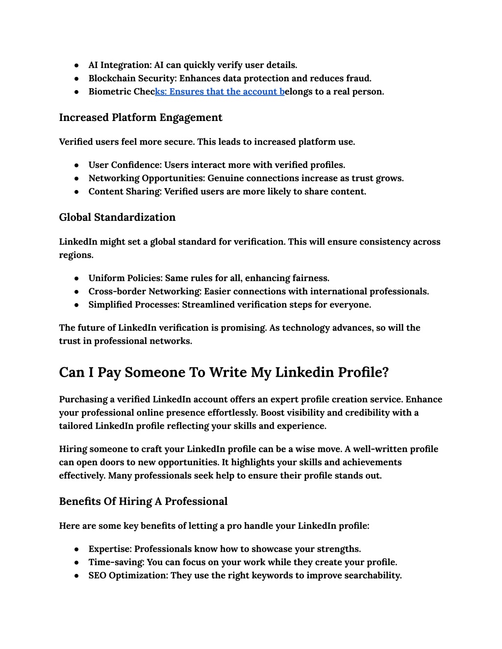 ● AI Integration: AI can quickly verify user details. ● Blockchain Security: Enhances data protection and reduces fraud. ● Biometric Checks: Ensures that the account belongs to a real person. Increased Platform Engagement Verified users feel more secure. This leads to increased platform use. ● User Confidence: Users interact more with verified profiles. ● Networking Opportunities: Genuine connections increase as trust grows. ● Content Sharing: Verified users are more likely to share content. Global Standardization LinkedIn might set a global standard for verification. This will ensure consistency across regions. ● Uniform Policies: Same rules for all, enhancing fairness. ● Cross-border Networking: Easier connections with international professionals. ● Simplified Processes: Streamlined verification steps for everyone. The future of LinkedIn verification is promising. As technology advances, so will the trust in professional networks. Can I Pay Someone To Write My Linkedin Profile? Purchasing a verified LinkedIn account offers an expert profile creation service. Enhance your professional online presence effortlessly. Boost visibility and credibility with a tailored LinkedIn profile reflecting your skills and experience. Hiring someone to craft your LinkedIn profile can be a wise move. A well-written profile can open doors to new opportunities. It highlights your skills and achievements effectively. Many professionals seek help to ensure their profile stands out. Benefits Of Hiring A Professional Here are some key benefits of letting a pro handle your LinkedIn profile: ● Expertise: Professionals know how to showcase your strengths. ● Time-saving: You can focus on your work while they create your profile. ● SEO Optimization: They use the right keywords to improve searchability.