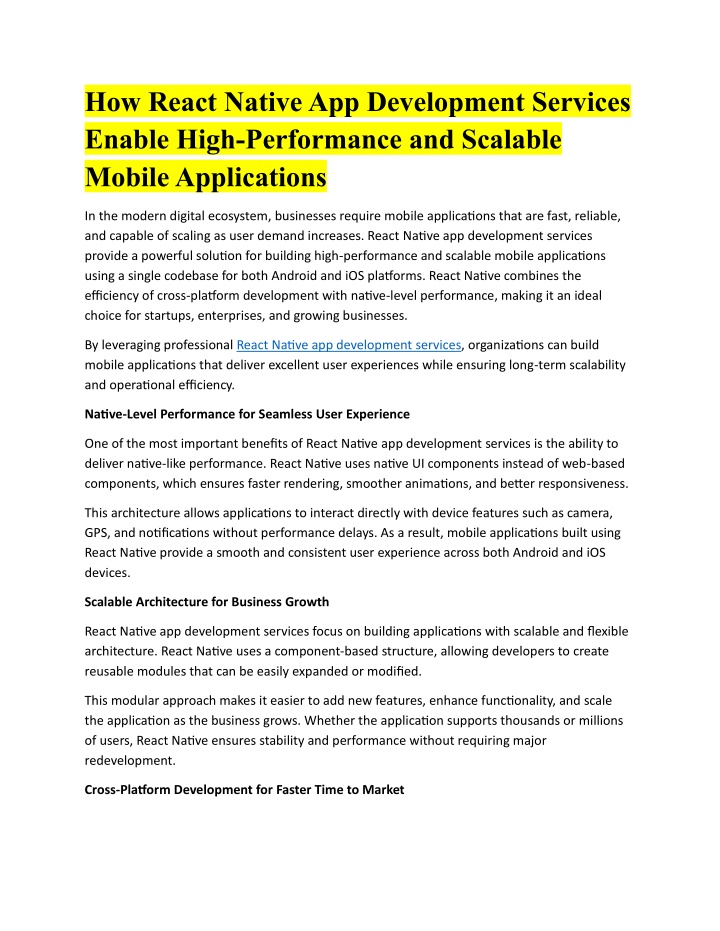 How React Native App Development Services Enable High-Performance and Scalable Mobile Applications In the modern digital ecosystem, businesses require mobile applications that are fast, reliable, and capable of scaling as user demand increases. React Native app development services provide a powerful solution for building high-performance and scalable mobile applications using a single codebase for both Android and iOS platforms. React Native combines the efficiency of cross-platform development with native-level performance, making it an ideal choice for startups, enterprises, and growing businesses. By leveraging professional React Native app development services, organizations can build mobile applications that deliver excellent user experiences while ensuring long-term scalability and operational efficiency. Native-Level Performance for Seamless User Experience One of the most important benefits of React Native app development services is the ability to deliver native-like performance. React Native uses native UI components instead of web-based components, which ensures faster rendering, smoother animations, and better responsiveness. This architecture allows applications to interact directly with device features such as camera, GPS, and notifications without performance delays. As a result, mobile applications built using React Native provide a smooth and consistent user experience across both Android and iOS devices. Scalable Architecture for Business Growth React Native app development services focus on building applications with scalable and flexible architecture. React Native uses a component-based structure, allowing developers to create reusable modules that can be easily expanded or modified. This modular approach makes it easier to add new features, enhance functionality, and scale the application as the business grows. Whether the application supports thousands or millions of users, React Native ensures stability and performance without requiring major redevelopment. Cross-Platform Development for Faster Time to Market