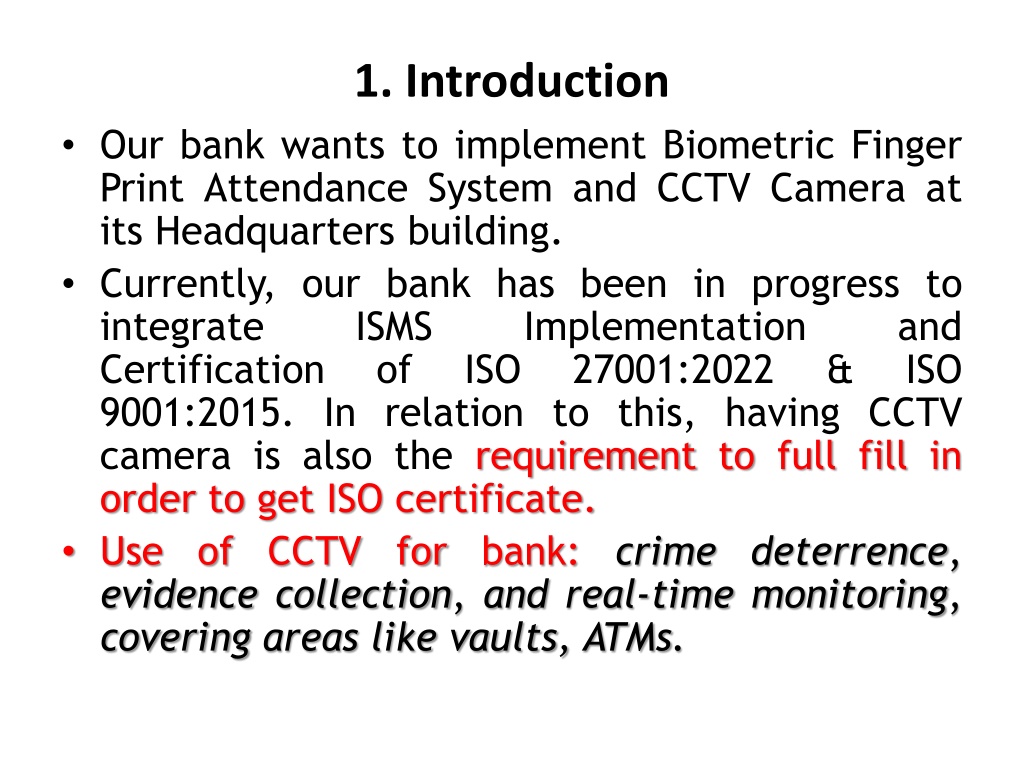2. 1. Introduction • Our bank wants to implement Biometric Finger Print Attendance System and CCTV Camera at its Headquarters building. • Currently, our bank has been in progress to integrate ISMS Implementation and Certification of ISO 27001:2022 & ISO 9001:2015. In relation to this, having CCTV camera is also the requirement to full fill in order to get ISO certificate. • Use of CCTV for bank: crime deterrence, evidence collection, and real-time monitoring, covering areas like vaults, ATMs.