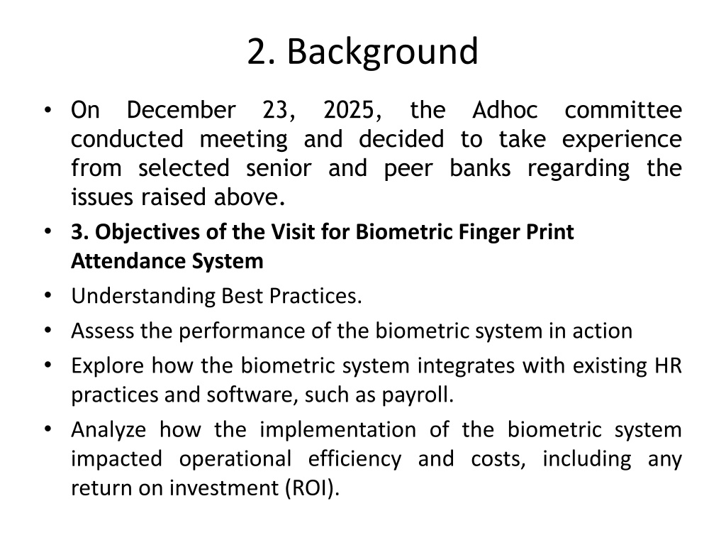 3. 2. Background • On December 23, 2025, the Adhoc committee conducted meeting and decided to take experience from selected senior and peer banks regarding the issues raised above. • 3. Objectives of the Visit for Biometric Finger Print Attendance System • Understanding Best Practices. • Assess the performance of the biometric system in action • Explore how the biometric system integrates with existing HR practices and software, such as payroll. • Analyze how the implementation of the biometric system impacted operational efficiency and costs, including any return on investment (ROI).