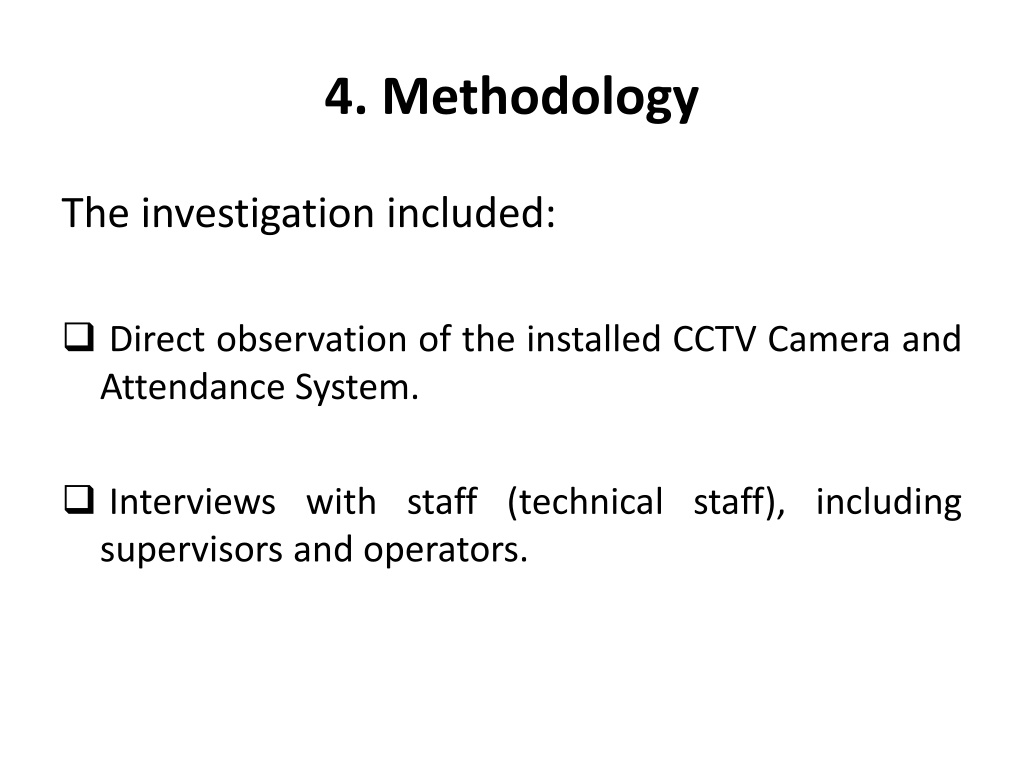 5. 4. Methodology The investigation included: • Direct observation of the installed CCTV Camera and Attendance System. • Interviews with staff (technical staff), including supervisors and operators.