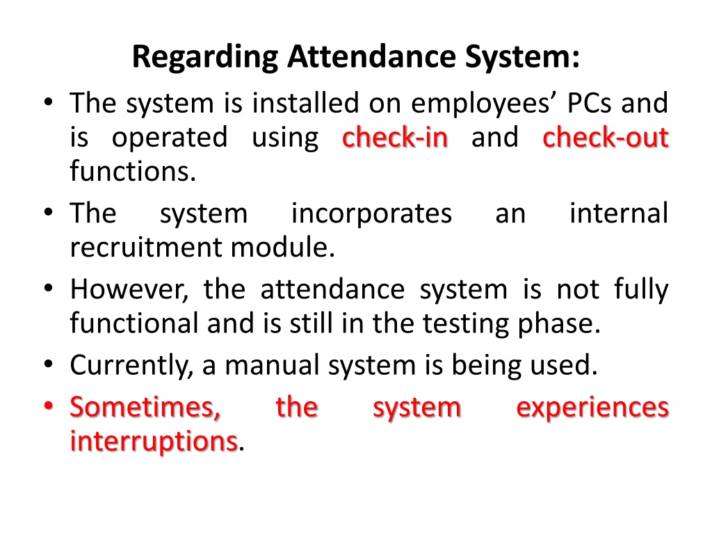 7. Regarding Attendance System: • The system is installed on employees’ PCs and is operated using check-in and check-out functions. • The system incorporates an internal recruitment module. • However, the attendance system is not fully functional and is still in the testing phase. • Currently, a manual system is being used. • Sometimes, the system experiences interruptions.