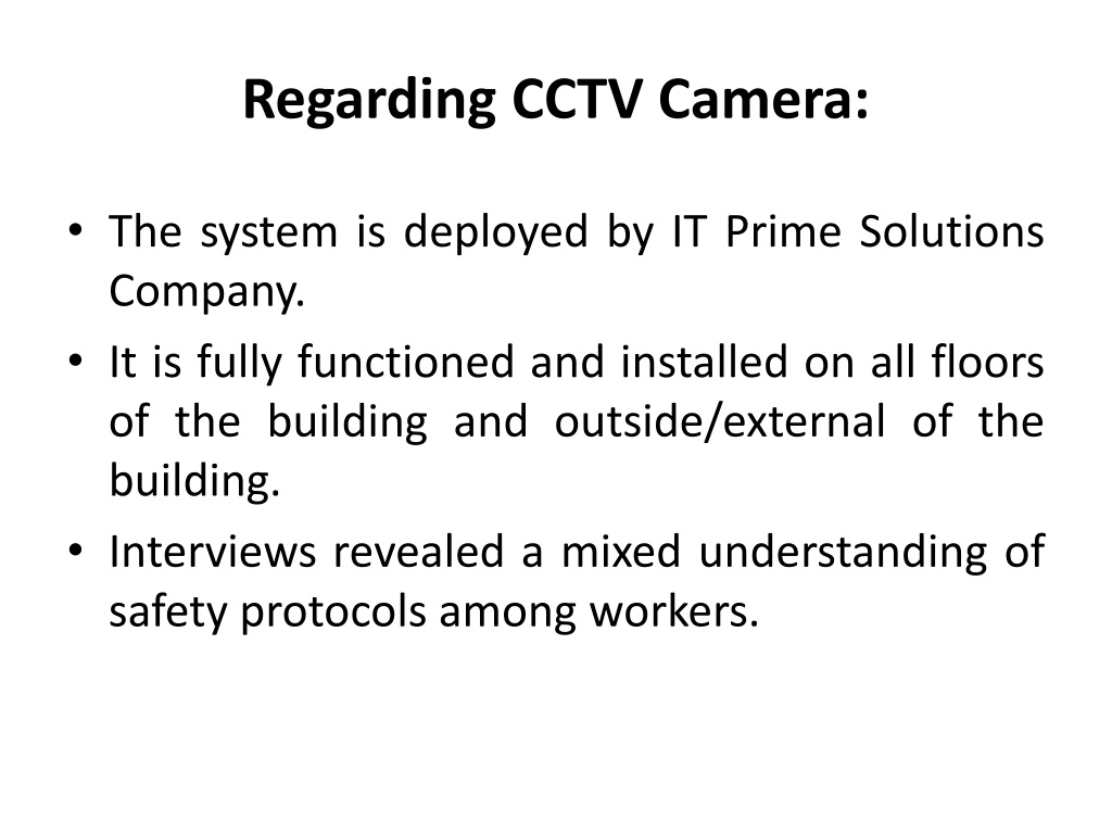12. Regarding CCTV Camera: • The system is deployed by IT Prime Solutions Company. • It is fully functioned and installed on all floors of the building and outside/external of the building. • Interviews revealed a mixed understanding of safety protocols among workers.