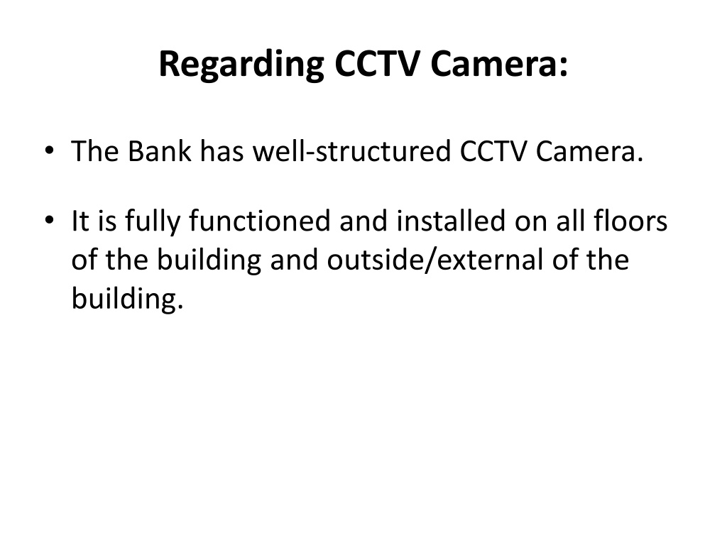 14. Regarding CCTV Camera: • The Bank has well-structured CCTV Camera. • It is fully functioned and installed on all floors of the building and outside/external of the building.