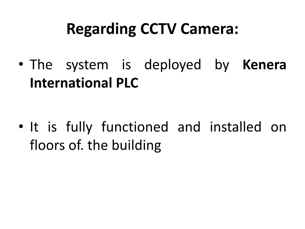8. Regarding CCTV Camera: • The system is deployed by Kenera International PLC • It is fully functioned and installed on floors of. the building