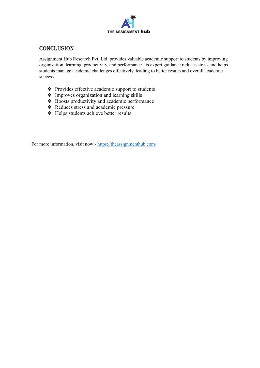 conclusion Assignment Hub Research Pvt. Ltd. provides valuable academic support to students by improving organization, learning, productivity, and performance. Its expert guidance reduces stress and helps students manage academic challenges effectively, leading to better results and overall academic success. ❖Provides effective academic support to students ❖Improves organization and learning skills ❖Boosts productivity and academic performance ❖Reduces stress and academic pressure ❖Helps students achieve better results For more information, visit now:- https://theassignmenthub.com/